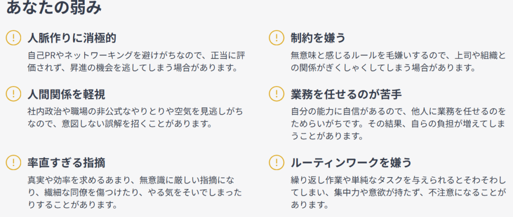 もちろん、良いことばかりではありません。診断結果には「弱み」もしっかり書かれていました。