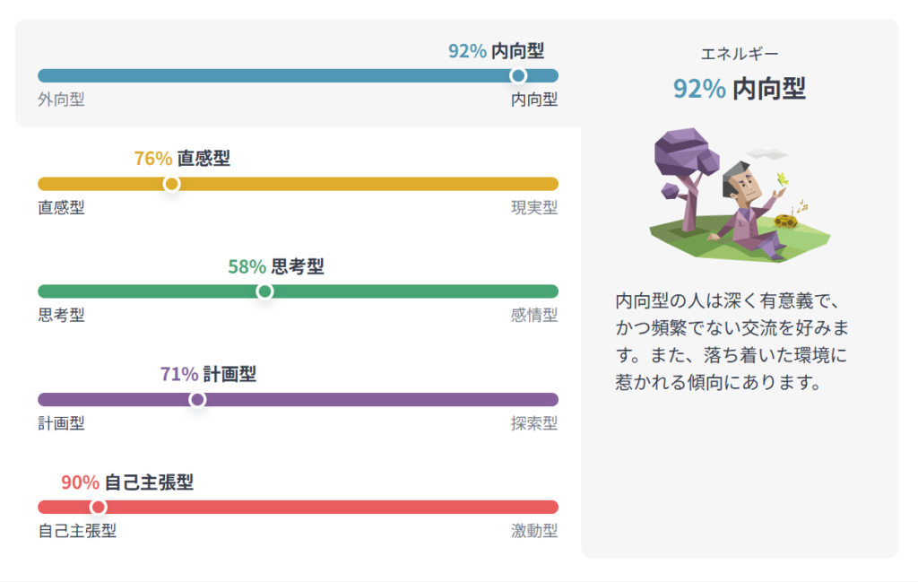驚いたのは、その数値。「内向型 92%」。 ……もう、ほとんど誰とも喋りたくないレベルですね(笑)。接客業としてどうなんだと自分でもツッコミたくなります。