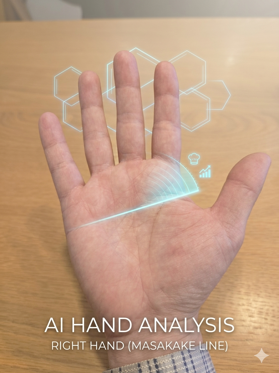 AI: 「そこがポイントです。左手(先天運)を見ると、細やかで調和を重んじる知性が伺えます。しかし、右手のこの強烈な『ますかけ線』。これはあなたが社会に出て、料理人としての厳しい修行や、経営者としての荒波に揉まれる中で、後天的に『勝負師の魂』を覚醒させた証といえるでしょう。」